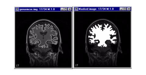 Tip: If the resulting masked image looks significantly lighter or darker than the original image, the new intensity value that you specified may be much higher or lower than the majority of other intensity values in the dataset. To change the LUT, do one of the following: (1) Click Quick LUT. Move the cursor to the resultant masked image and draw a box around an area where the intensity value was not changed. MIPAV uses these values to remap the image data to the LUT. (2) Adjust the LUT in the Lookup Table window. For more information on how to do this, refer to the MIPAV User's Guide, Volume 1. |