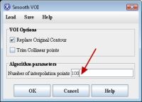In the Smooth VOI dialog box, check the "Replace Original Contour" box, and set "Number of interpolation points" to 100. Click OK. Repeat for all 3 contours.