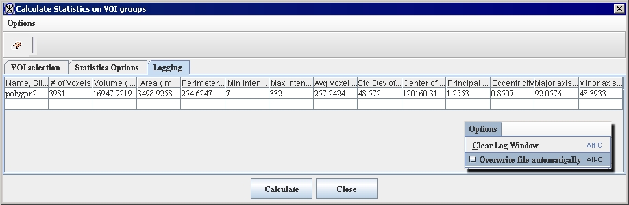 Return to the VOI selection page and choose another file name in the VOI statistic file destination box. Then click Calculate to obtain the new set of statistics. The Statistics Generator calculates the statistics and saves them in the file that you indicated. The statistics appear on the Logging page.