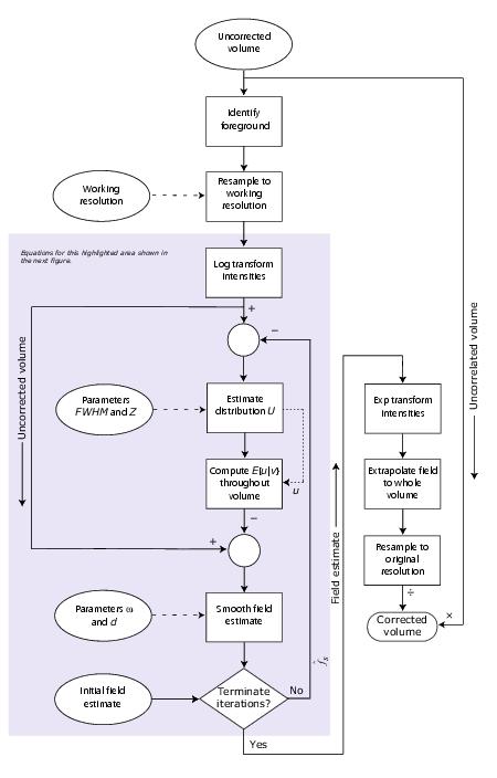 This preprocessing algorithm corrects for shading artifacts often seen in MRI. The heart of the algorithm is an iterative approach that estimates both a multiplicative bias field and a distribution of true tissue intensities. Referred to as nonparametric intensity nonuniformity normalization (N3), this method makes no assumptions about the kind of anatomy present in a scan and is robust, accurate, and fully automatic.