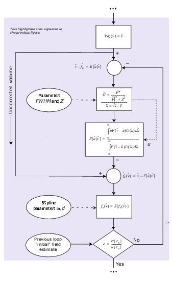 Now the model of intensity nonuniformity used here is that of a multiplicative field corrupting the measured intensities. However, viewing the model from a signal processing perspective, one sees that there is a much more specific consequence, a reduction of only high-frequency components of U. Thus, the approach used in the N3 algorithm to correct for nonuniformity turns into an optimization problem, which goal is to maximize the frequency contents of U.