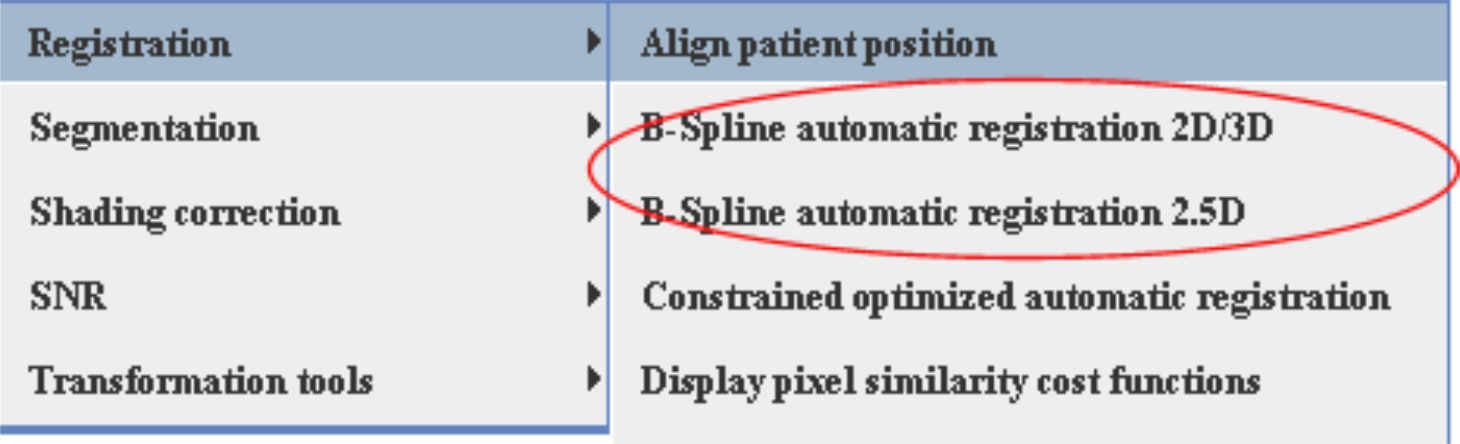The choice of 2D/3D or 2.5D B-Spline registration is made by selecting the appropriate menu item from the Algorithms: Registration submenu of MIPAV.