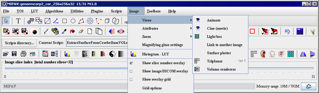 To gain access to views other than the default view, you use the Image > Views menu (Figure 1) in the MIPAV window. Figure 1 lists the types of views and the number of images each view displays at one time and indicates whether images are manually or automatically advanced in the view and the number of dimensions an image must have to be displayed in the specified view. For example, you can view an image dataset that has three or more dimensions in cine view, which displays only one image at a time and advances images in the forward direction only.