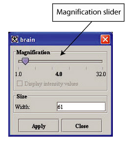 3 Specify the size of the magnifying region (box) in the Width text box. (The width and the length are the same.) Values are in voxels.