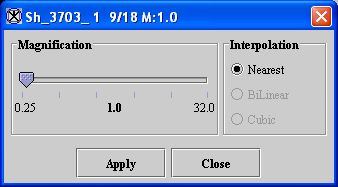 In the default view you can magnify or minify, or reduce, displayed images. When you display an image, the magnification level is indicated on the title bar of the window. For example, M:4.0 indicates that the image was magnified by a factor of four times the original size. You can also use the magnifying glass to temporarily magnify or reduce a region of the image. You can magnify images to 32 times their original size, reduce them to one-fourth their original size, or restore them to their original size.