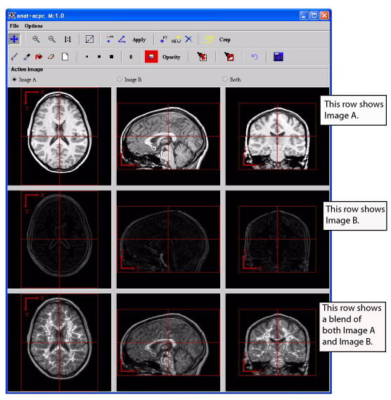 Like the triplanar view, you can use the icons and buttons on the toolbar to change magnification, draw, change colors, change opacity, and apply a new intensity to selected voxels in the images.